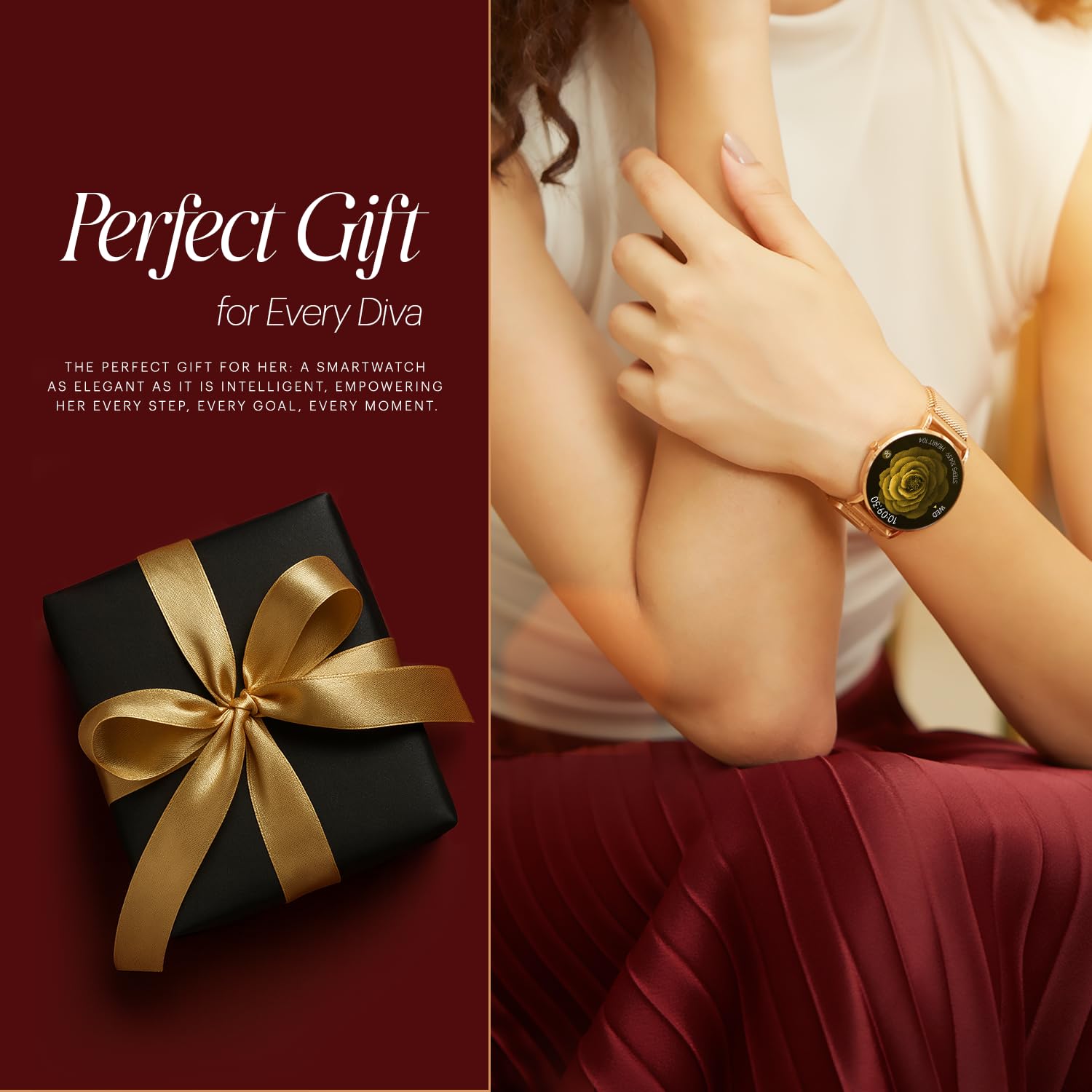 Brilliant AMOLED Display: Enjoy vivid colors and deep contrasts on the crystal-clear AMOLED screen, offering an immersive viewing experience., Luxury Build: Premium materials with a refined finish, designed to provide a luxurious touch to your wrist., Notifications, Sleek & Sophisticated Design: Crafted for elegance, this smartwatch complements any look, from casual to formal., TouchscreenHealth & Fitness Tracking: Monitor your heart rate, sleep patterns, steps, and more, keeping you on track with your wellness goals.